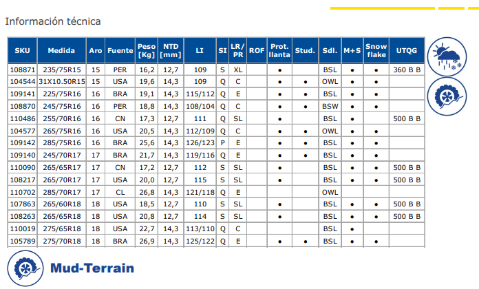 Excepcional para todo tipo de terrenos, gracias a su diseño de avanzada y su tecnología TractiveGroove, asegura la mejor tracción, aún en condiciones extremas. Entrega una gran duración, gracias a sus compuestos especiales de alta resistencia contra cortes, desgarros e impactos.